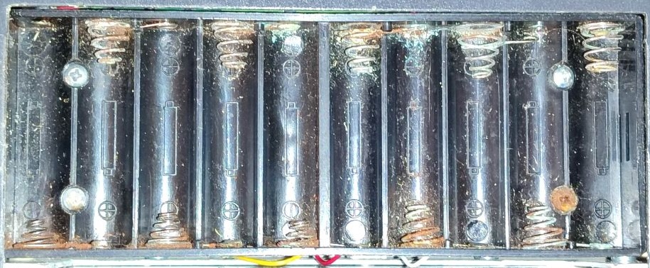 Rezavé železné pružinky, modrozelené zbarvení měděných nýtů a bílé krystalky signalizovaly, že zde došlo k úniku elektrolytu z baterie. V držáku bylo zasunuto 10 alkalických článků velikosti AA, které stále vykazovaly relativně dobrý stav. Články jsem vyjmul a zkontroloval desku plošných spojů. Moje obavy se naplnily. Vyteklý elektrolyt zasáhl velkou část desky plošných spojů, zvláště v okolí citlivých zesilovačů diodových detektorů u měřicího můstku.